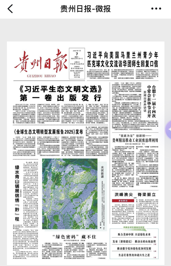 7月6日,貴州日?qǐng)?bào)頭版頭條報(bào)道了由中國(guó)水電一局承建的大方光伏項(xiàng)目。鏡頭下,一排排湛藍(lán)色的光伏板與青山交相輝映,為區(qū)域能源轉(zhuǎn)型和綠色發(fā)展注入了強(qiáng)勁動(dòng)力,同時(shí)帶動(dòng)地方實(shí)現(xiàn)經(jīng)濟(jì)與生態(tài)雙贏。