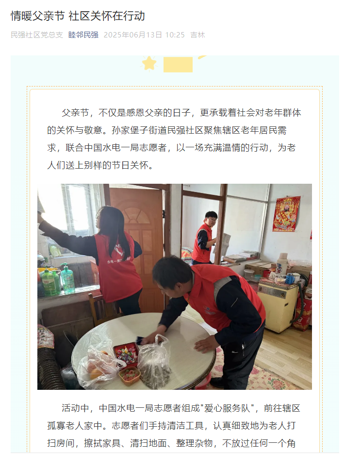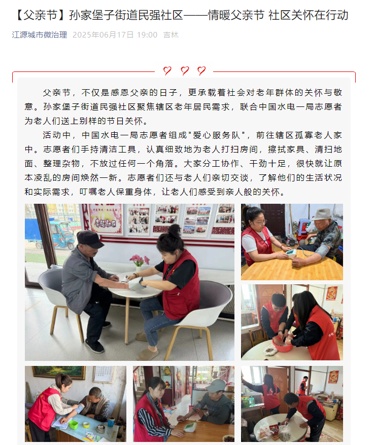 父親節,不僅是感恩父親的日子,更承載著社會對老年群體的關懷與敬意。孫家堡子街道民強社區聚焦轄區老年居民需求,聯合中國水電一局志愿者為老人們送上別樣的節日關懷。