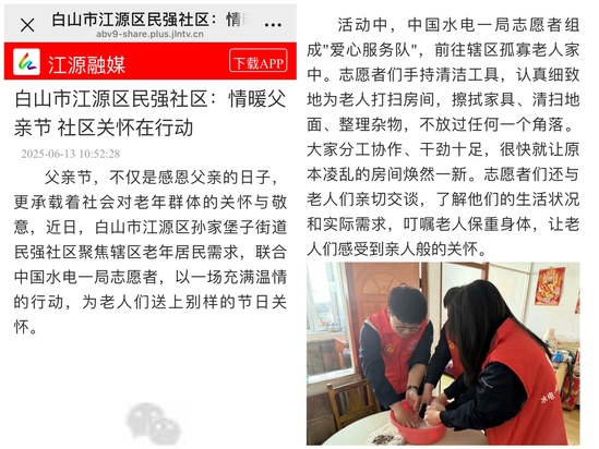 父親節(jié),不僅是感恩父親的日子,更承載著社會對老年群體的關(guān)懷與敬意,近日,白山市江源區(qū)孫家堡子街道民強社區(qū)聚焦轄區(qū)老年居民需求,聯(lián)合中國水電一局志愿者,以一場充滿溫情的行動,為老人們送上別樣的節(jié)日關(guān)懷。 活動中,中國水電一局志愿者組成"愛心服務(wù)隊",前往轄區(qū)孤寡老人家中。志愿者們手持清潔工具,認真細致地為老人打掃房間,擦拭家具、清掃地面、整理雜物,不放過任何一個角落。大家分工協(xié)作、干勁十足,很快就讓原本凌亂的房間煥然一新。志愿者們還與老人們親切交談,了解他們的生活狀況和實際需求,叮囑老人保重身體,讓老人們感受到親人般的關(guān)懷。 此次活動不僅為老人創(chuàng)造了整潔舒適的居住環(huán)境,更傳遞了社區(qū)對老年群體的關(guān)愛。下一步,民強社區(qū)將持續(xù)開展多樣化的惠民服務(wù),用心用情解決居民實際需求,不斷提升居民的獲得感和幸福感。 |