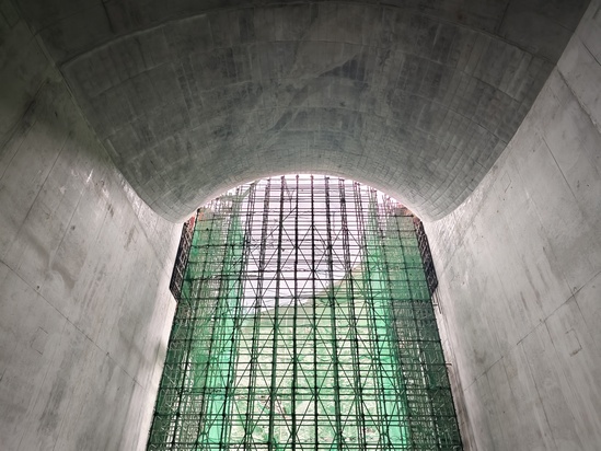 導流洞進口漸變段作為項目的關鍵節點,施工難度和技術要求極高。該段結構設計獨特,采用橢圓線結構表面,最大斷面高度達19.65米,最小斷面高度為15.40米,使用特制異形模板進行拼模,對混凝土澆筑工藝和質量控制提出了嚴苛的挑戰。為確保澆筑工作的順利進行,項目部質量管理團隊34小時輪班緊盯作業面現場,安全和技術人員時刻關注澆筑過程中的模體形態及安全風險點。從備倉階段的模板拼模、澆筑過程的實時監控到后期的養護管理,每一個環節都力求精益求精,及時調整施工參數,確保了澆筑質量的穩定性。